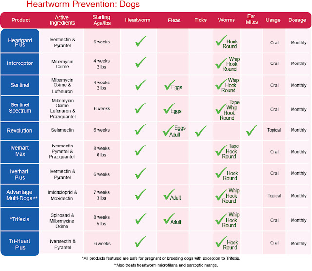 Now that you know the dangers of heart-worm disease you can rest assured that you CAN prevent this awful disease. Consistently giving a heart-worm preventative will protect your beloved pet and keep them safe from this sickness. Perfect! The next question pet owners will ask is "What type of heart-worm preventative is right for my pet?' There are a number of options out there and this is something that your veterinarian will gladly discuss with you and help you choose what is right for your pet and their lifestyle. Heart-worm medication can come in a variety of ways, a beefy treat chew, a tablet, a topical, etc. Choosing which is best for your pet will depend on a number of variables. First off , will your pet take the edible medication or is applying a little oil on their back easier for the pet owner. Is it best for your pet to have flea protection as well? Is your dog around other dogs where they are at risk for intestinal worms and parasites? Yes most heart-worm medication also contains protection against intestinal parasites as well. For instance, HeartGard is a beefy chew that not only protects against heart-worm disease but also, hook worms and round worms. While Trifexis is a tablet that protects against heart-worm, fleas, hook worm, round worm and whip worm. An alternative to an edible form is Advantage Multi which covers, heartworm, fleas, hooks, whips, and round worms. There are many options and discussing your pets risks with your Veterinarian will help you decide on which is right for your pet. You can also compare on the chart below.